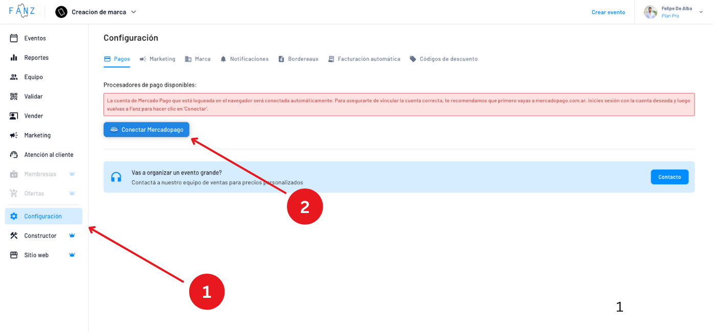 Conectar tu cuenta de Mercado Pago es obligatorio para poder crear eventos y vender tickets en Fanz. El proceso es extremadamente simple: un solo clic y listo.