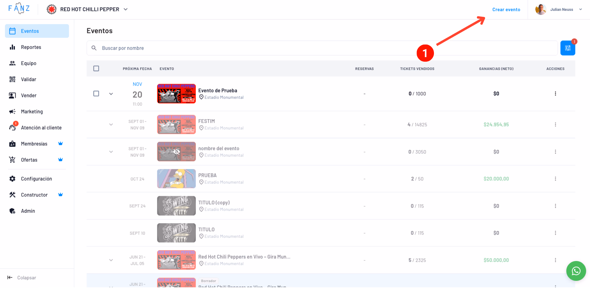 Hacé clic en el botón "+ Crear evento" en la esquina superior derecha.
