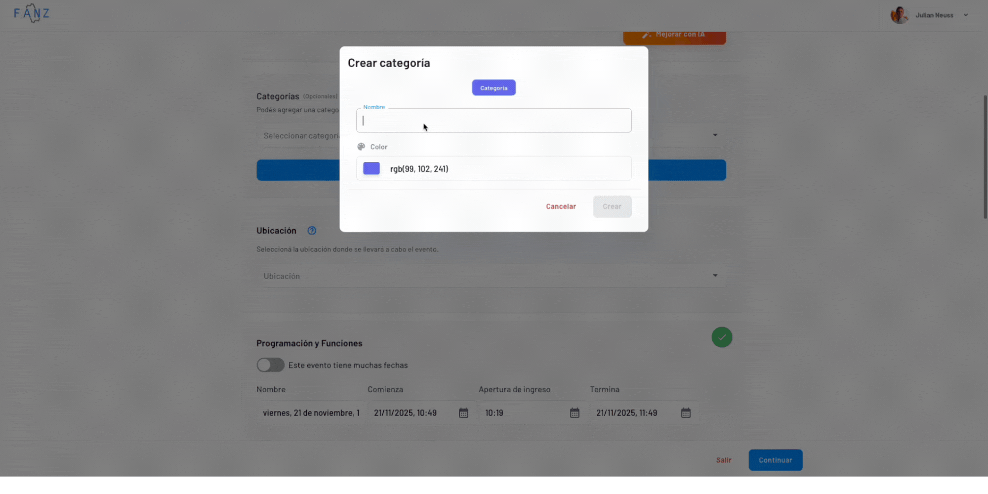 Si no tenés categorías creadas, hacé clic en "+ Crear categoría" para agregar una nueva. Los compradores podrán filtrar eventos por categoría en tu sitio web.