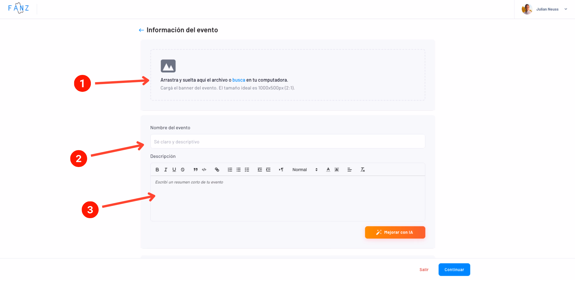Crear un evento en Fanz es un proceso guiado paso a paso que te llevará aproximadamente 5-10 minutos. El sistema te va guiando por cada sección para que no te olvides de nada.
