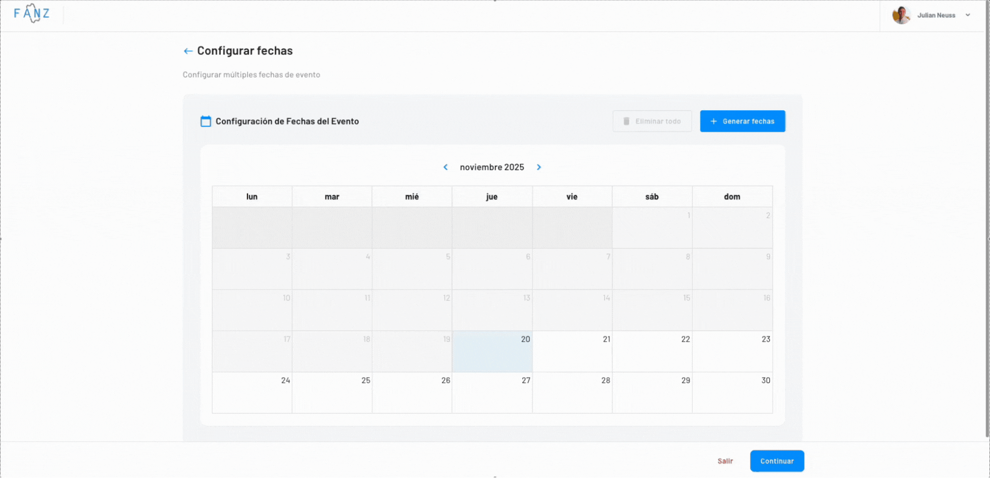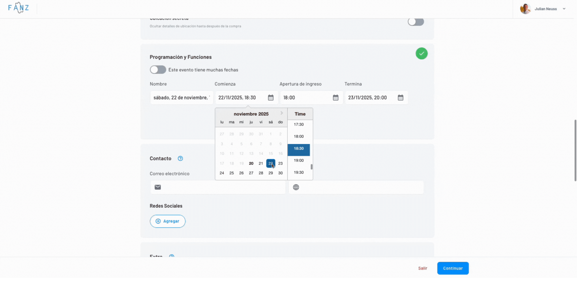 Sí, Fanz tiene compatibilidad para eventos de una sola función, unas pocas funciones (que podés agregar manualmente) o muchas funciones (usando el generador automático de fechas). Elegí la opción que mejor se adapte a tu evento en el paso de fechas y horarios.