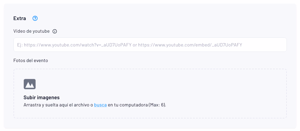 Podés agregar hasta 6 imágenes adicionales (cada una menor a 1MB) que aparecerán en el detalle del evento, debajo del video de YouTube si lo hubiera.