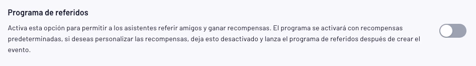 Activá esta opción para permitir a los asistentes referir amigos y ganar recompensas. El programa se activará con recompensas predeterminadas. Si querés personalizar las recompensas, dejá esto desactivado y lanzá el programa de referidos después de crear el evento.