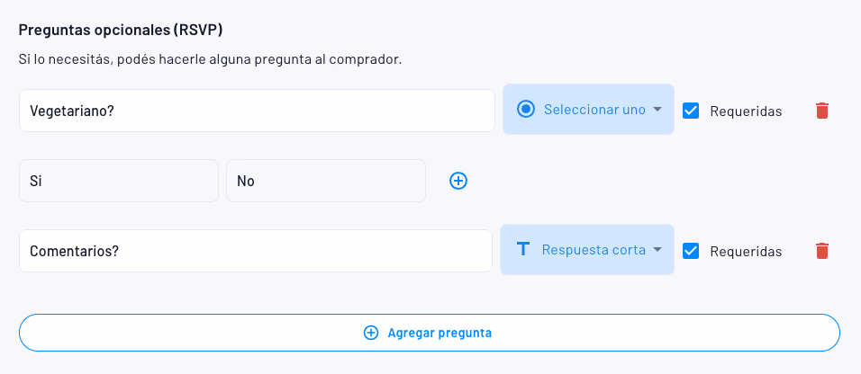 Ejemplo: "¿Tenés alguna restricción alimentaria?" o "¿Cómo te enteraste del evento?"