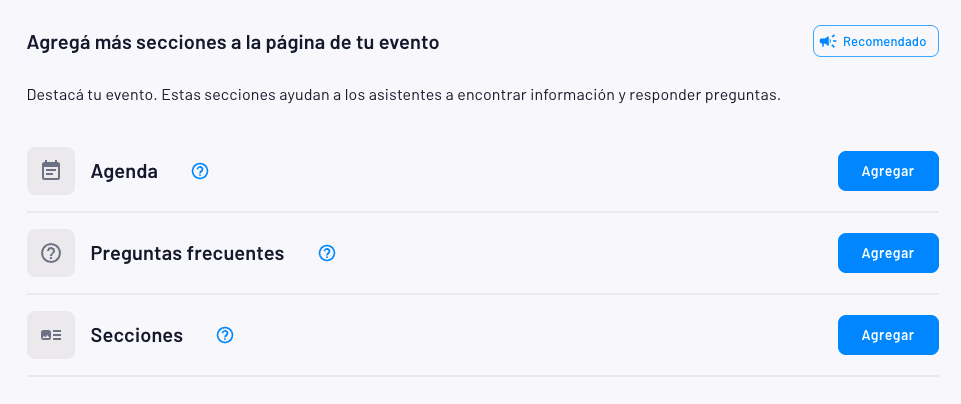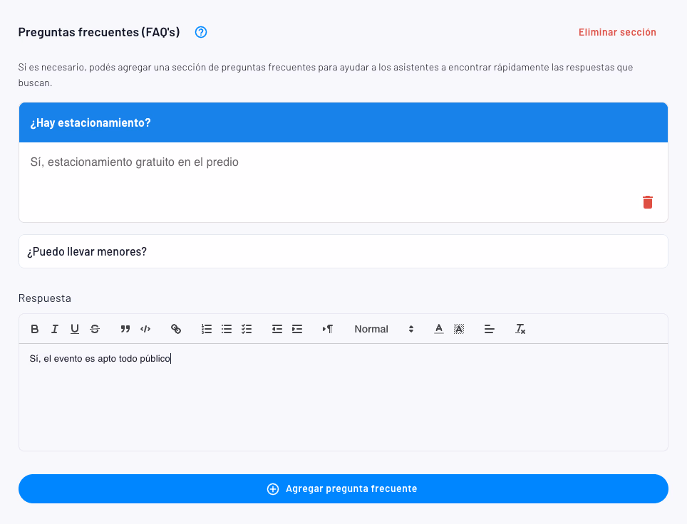 Agregá preguntas y respuestas que aparecerán en la página del evento. Ejemplo:
