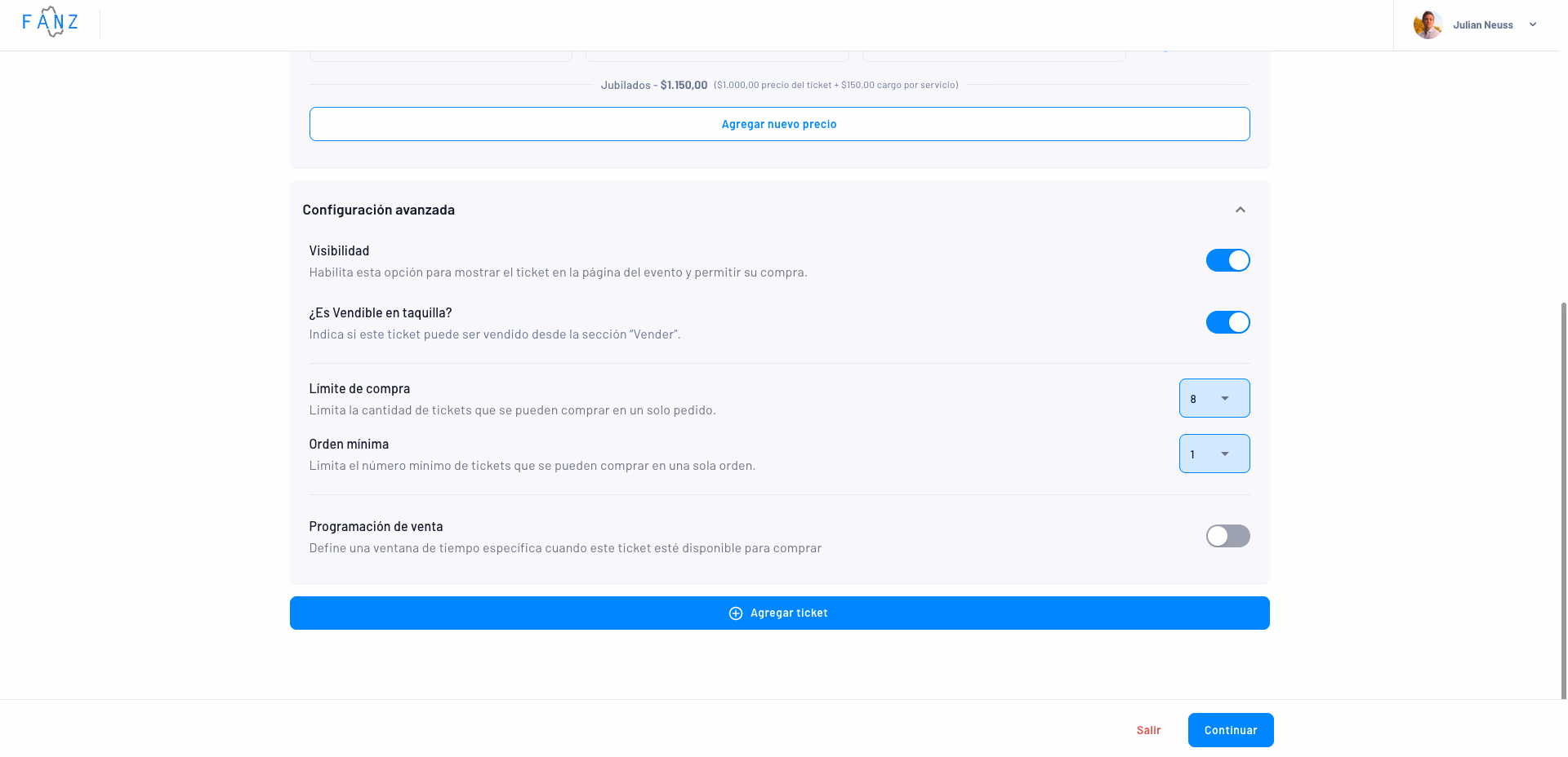 - Programación de venta – Definí una ventana de tiempo específica cuando este ticket esté disponible para comprar