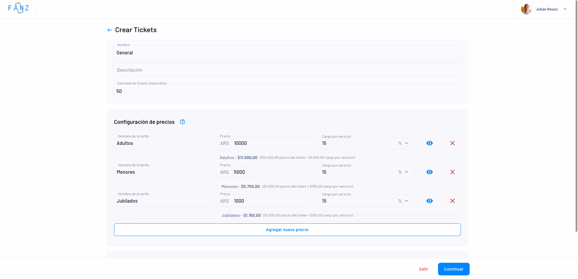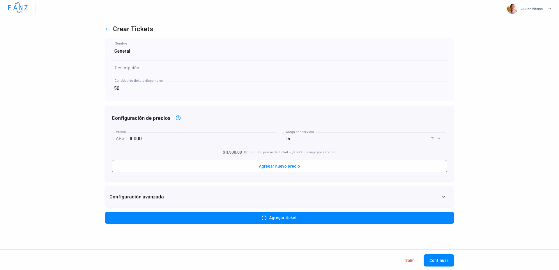 Hacé clic en "Continuar" y llegarás al creador de tickets.